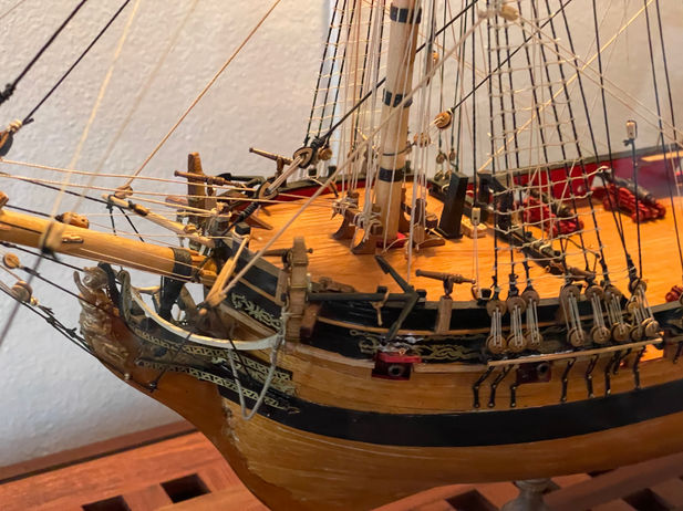 Larry began building model wooden ships while working away from home in Toronto, Canada in 1998. His love of sailing combined with his artistry and woodworking skills led to a love of model ship building. He has built around eight ships, all based on kits developed from historic ships. They are hand planked and rigged. He enjoys building now in his backyard woodshop and studio.